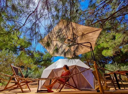 Foça Dome Glamping Suits, İzmir’in tarihi ve doğal güzellikleriyle ünlü Foça ilçesine bağlı Kozbeyli Köyü sınırları içerisinde, çam ve zeytin ağaçlarının gölgesinde izole bir tatil deneyimi sunmaktadır. Tesis, doğayla iç içe olma felsefesini modern konforla birleştiren özel tasarım glamping çadırları ile hizmet vermekte olup, misafirlerine hem mahremiyet hem de ferah bir yaşam alanı sağlamayı amaçlamaktadır. Konaklama birimlerinin en dikkat çekici mimari özelliği olan şeffaf tavan yapısı, konukların gece boyunca gökyüzünü izlemesine olanak tanırken, geniş ahşap teraslar kişisel kullanım alanı olarak öne çıkmaktadır. Tesisin sunduğu olanaklar ve bölge avantajları şu şekilde sıralanabilir: